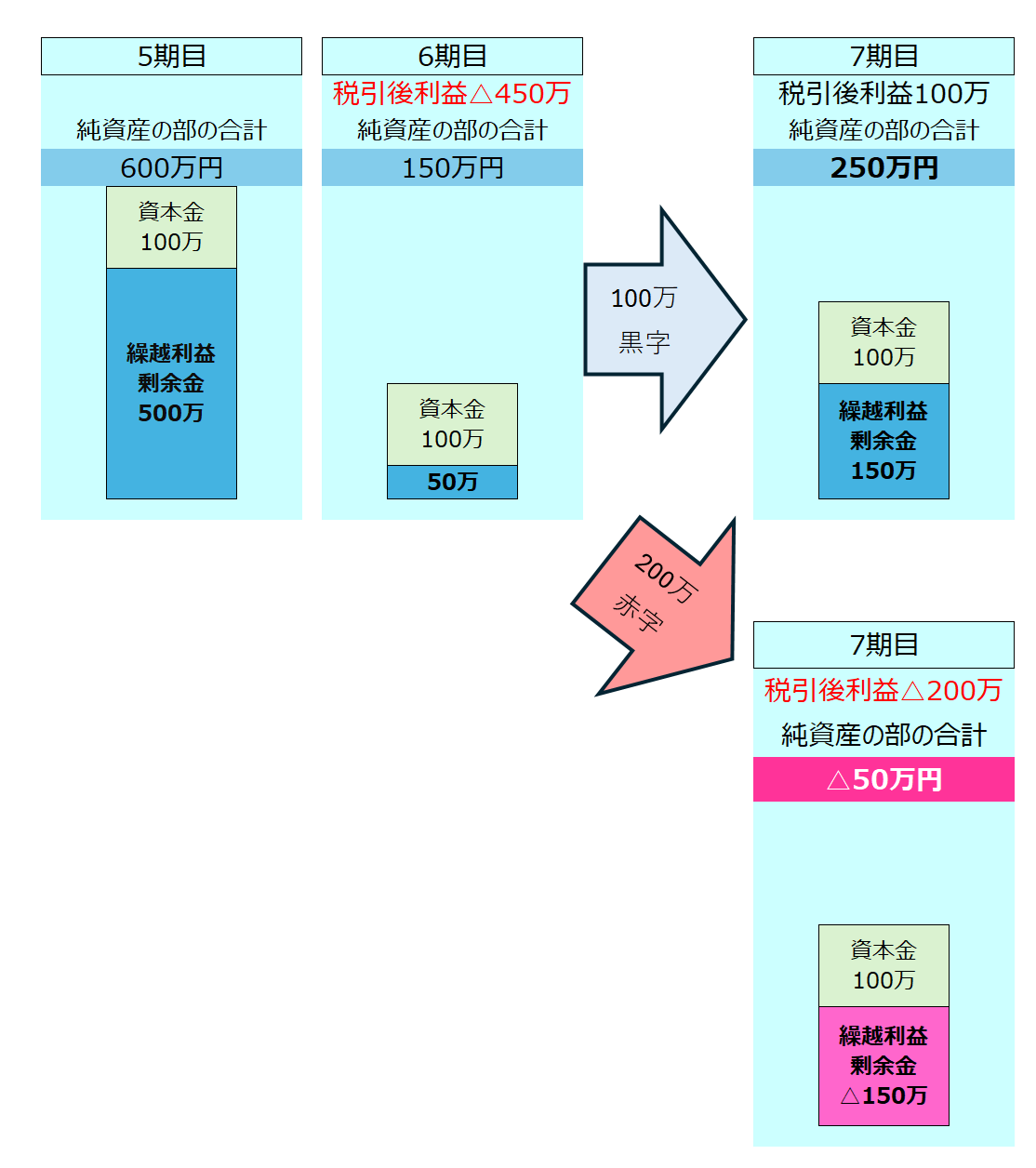 6期目に450万円の赤字でも、まだ純資産は150万円あり、債務超過ではありません。しかし7期目にさらに200万円の赤字になると、債務超過になります。