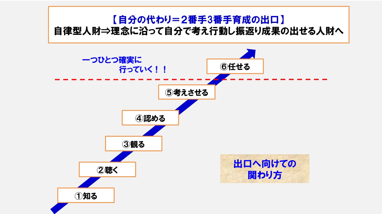 そして、仕事を任せる相手の考える力を強くすることです。そのために質問をする、振り返らせることです。考える力が強くないと受身、依存になるからです。自分で考えて行動する=自律型に促していくことです。この取り組みをしたうえで、仕事を任せていくことになります。