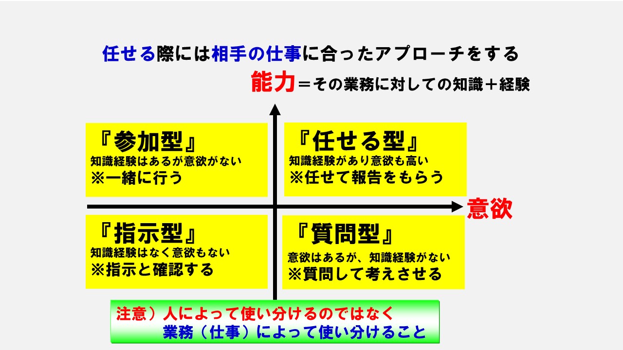 このように相手に任せる仕事は、相手の状況に応じてアプローチを変えていくことです。自身のアプローチを変えながら、最終的には任せる仕事に対して相手が知識・経験もあり、意欲もある状態にすることです。どこか一つのアプローチでやっていくとうまくいかないのです。
