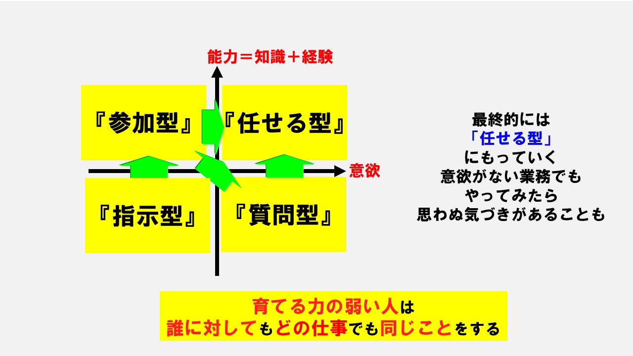 また知識・経験がなく意欲もない仕事も、実際にやってみたら自分に合っていたとか楽しくなり、いきなり任せる型になることもあります。仕事を任せていくときにはこの4パターンで考えてみてください。