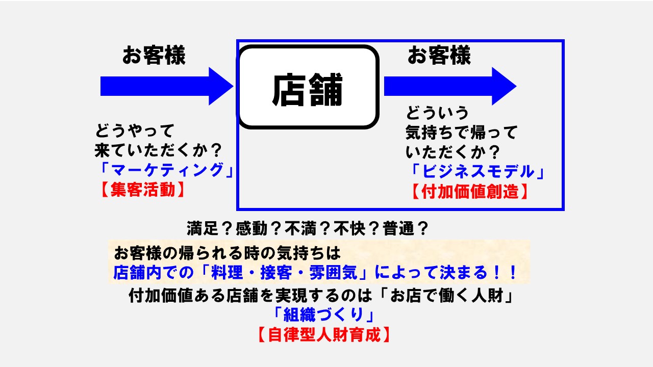 では、なぜ帰るときにこのように気持ちが分かれるのでしょうか?それはお客様が店舗で食事をしているときの料理や接客、キレイさや雰囲気です。お店の中がどうであったかで満足もするし、不満を感じもするのです。このお店の中の料理や接客や清掃衛生、雰囲気が2つ目の「ビジネスモデル」の視点です。