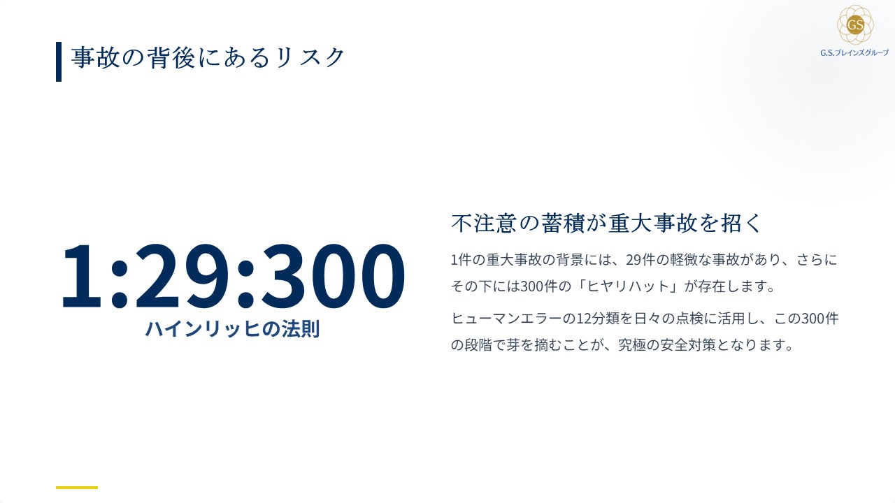 安全管理の世界には「ハインリッヒの法則」という有名な言葉があります。