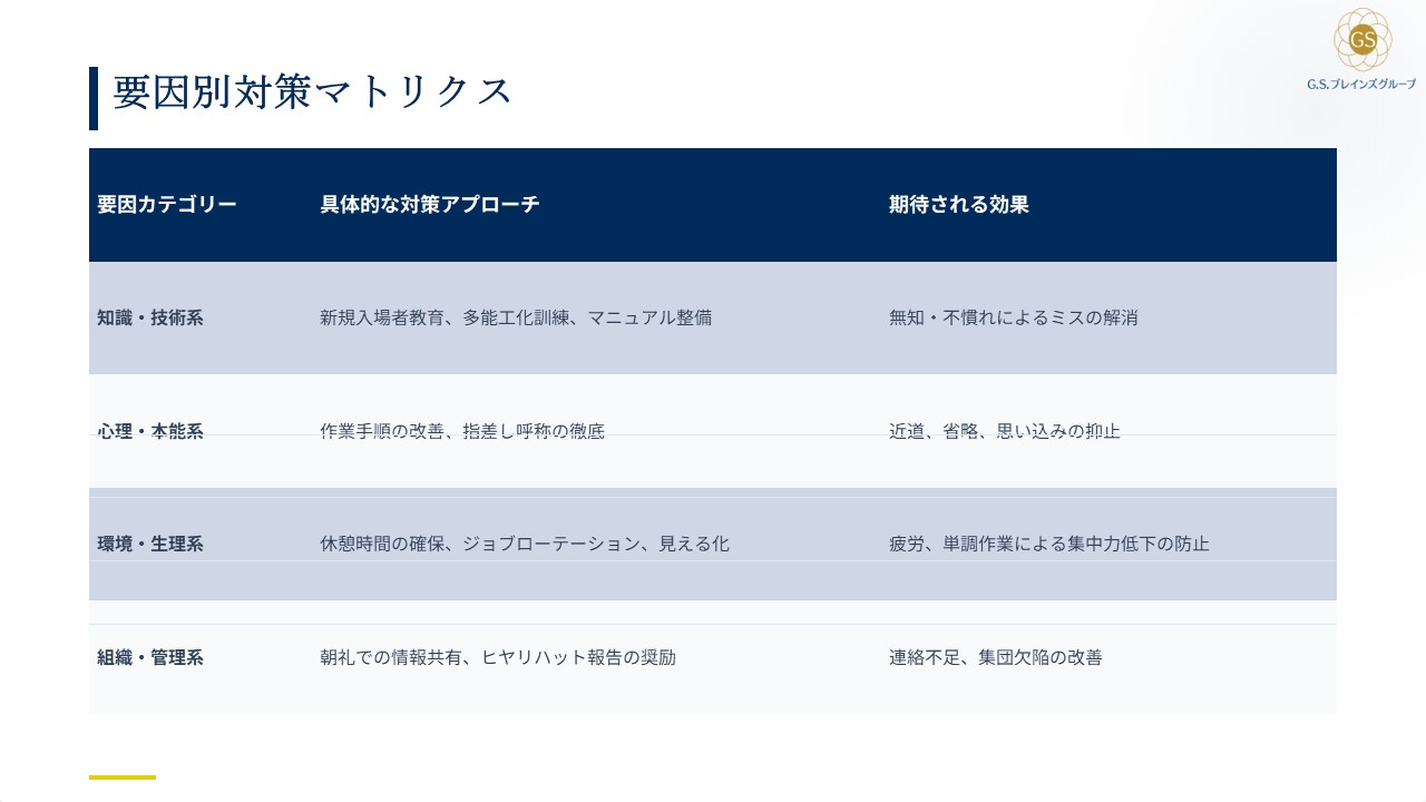 マニュアルの整備や多能工化(業務の属人化解消)を進め、知識不足を補うとともに、チャットツール等での「連絡の活性化」で状況認識のズレを防ぎます。仕組みとしてはダブルチェック体制の構築も重要です。