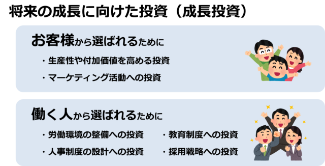 例えば、設備投資、マーケティング、人材採用、教育研修などが挙げられます。これらの投資は、企業の持続的な成長を支える重要な取り組みです。