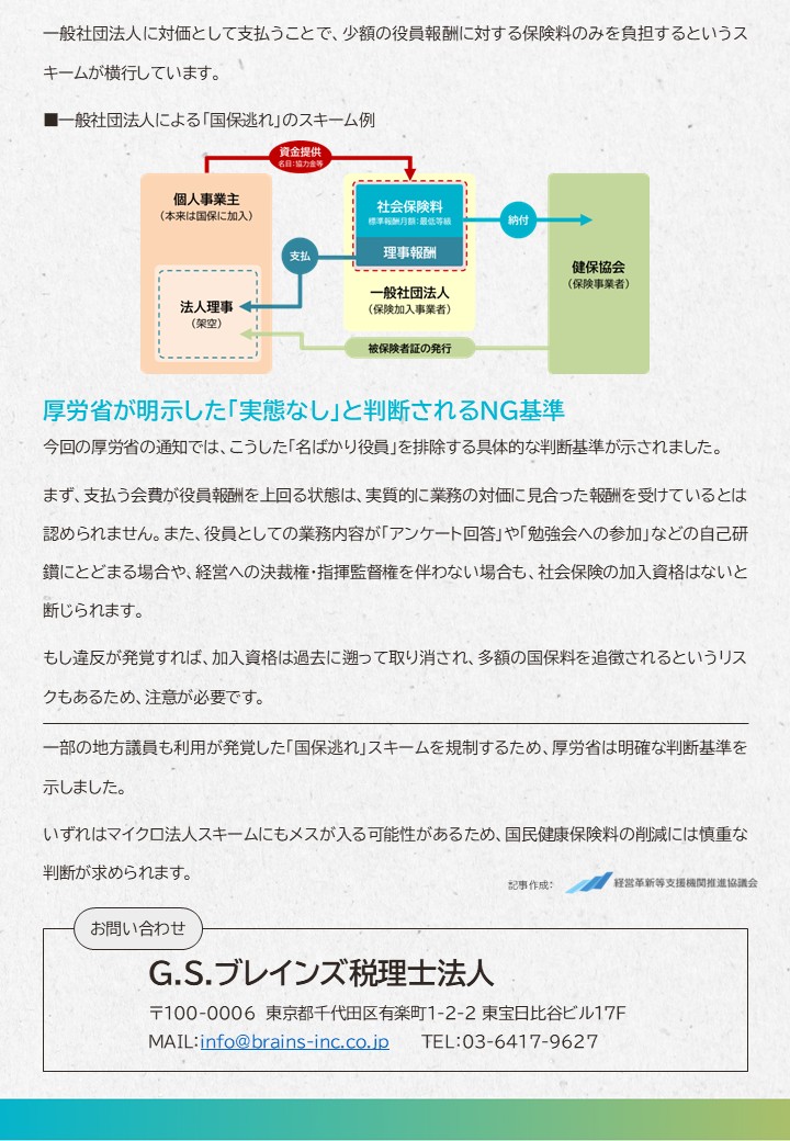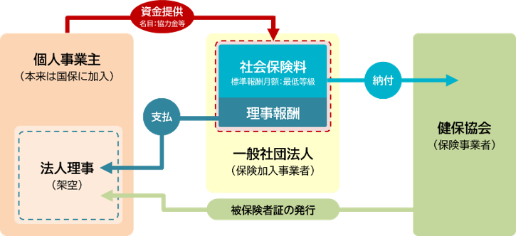 本来は国民健康保険(国保)に加入すべき個人事業主が、その保険料を削減するために、一般社団法人などの役員として形式的に就任し、健康保険や厚生年金に切り替えるものです。