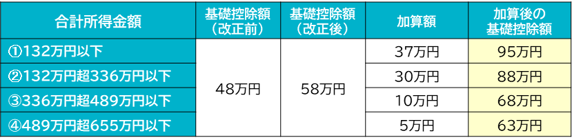 所得税における基礎控除が大幅に改正され、所得金額に応じた段階的な控除が導入されます。